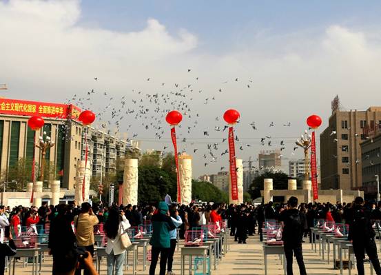 4月25日正午,在阳光的映照下,一群白鸽在焉耆县人民广场上空自由翱翔。焉耆县人民广场上熙熙攘攘,热闹非凡,“丝路山水•壮美巴州•相约焉耆”焉耆首届鸽文化旅游节暨信鸽、观赏鸽、筋斗鸽邀请赛(以下简称焉耆鸽文化旅游节)正在举行,来自全国各地的养鸽爱好者们欢聚一堂,以鸽会友,共度这一鸽界的盛会。