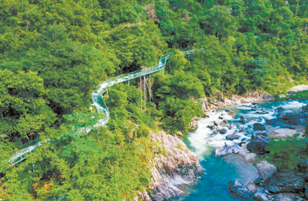 龙湾潭地处楠溪江东北角,是国家级森林公园,有各类自然景观51处,七折飞瀑碧潭,蔚为壮观。这里是世界珍稀楠木的保存地,境内野生动物、天然药材资源丰富,被誉为“浙南第一天然药王国”。从岩上民宿村出发,沿游步道,饱览山光水色之余,还能体验各种网红玩法,可以租条玻璃船,飘荡于水天之间,也可踏上悬空栈道,穿梭峡谷密林,还有魔鬼秋千、高空秋千、高空自行车、步步惊心等高空旅游项目。