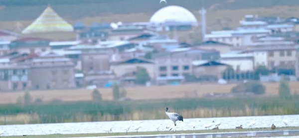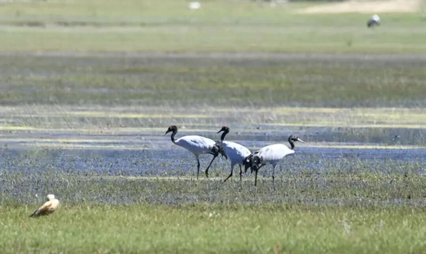 此刻的纳帕海,水草丰茂,水面如镜,优雅的黑颈鹤或低头觅食,或展翅踱步,与秋日暖阳构成一幅和谐的生态画卷。