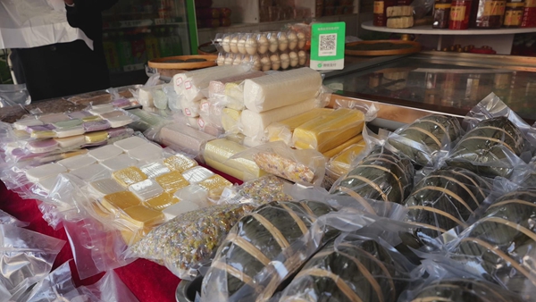 土特产店里的货架上摆着满满当当各式风物,真空包装的腊味油润醇香,玻璃罐里的辣椒酱红亮鲜爽,还有各类酥点,种类繁多可供往来的客人挑挑拣拣,在这里总能寻到心仪的家乡味,或是想带给远方亲友的地道心意。“接近年关了,我们土特产店的米花、狮子糕、腊肉这些物品都很受欢迎,客户买回去后反馈比较好,销量也很稳定,每天都有装礼盒邮寄的。特别是粽子这些,一天煮两锅都能卖完。”土特产店店主罗开权脸上乐开了花。
