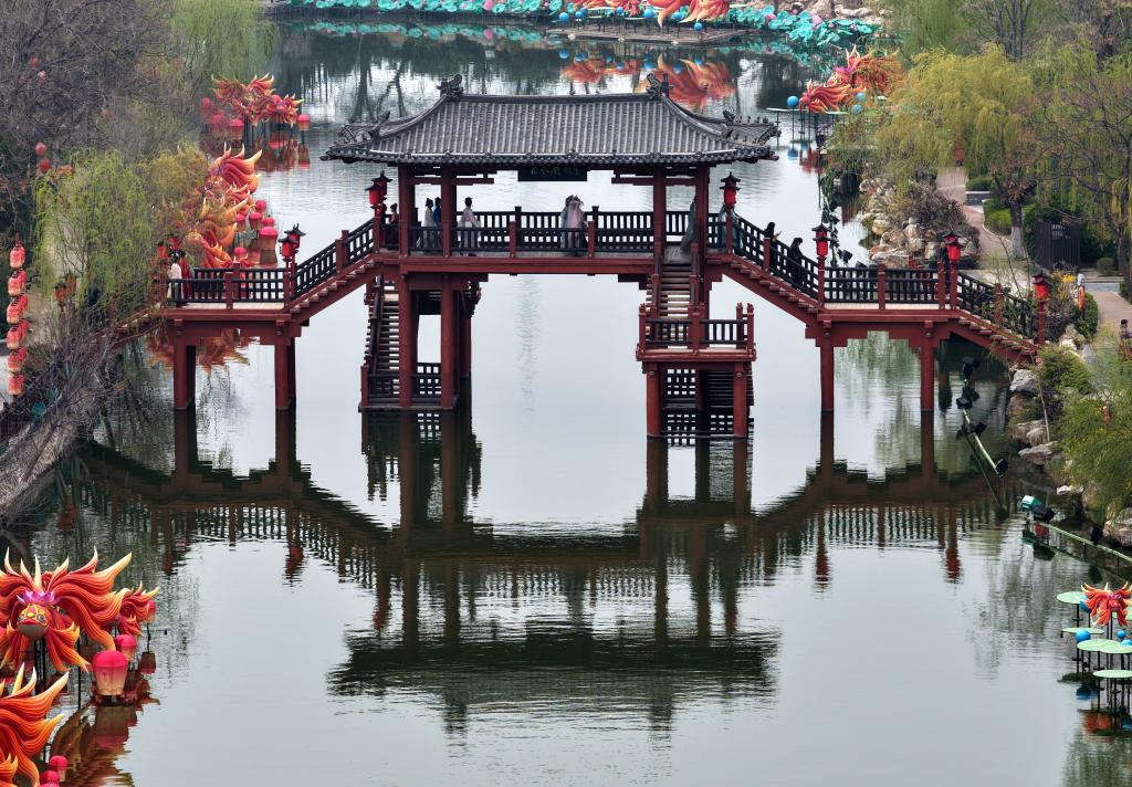 2025年3月6日,游客在开封清明上河园景区游玩(无人机照片)。新华社记者李嘉南摄